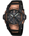 Accented in rich IP (ion-plated) Rose Gold, the GIEZ (GS1100BR-1A), is a 5-motor chronograph timepiece with both shock and 200M water resistance. The GIEZ achieves a strong, sophisticated design utilizing a solid stainless steel case and unique minimalist urethane bezel to allow for complete shock resistance and radio signal reception. Additional features include 1/20 second chronograph, world time (27 cities), daily alarm and perpetual calendar.