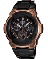 The MT-G (MTG1000BR-1A) features the rich rose gold color on both the case and the dial, while combining materials of stainless steel, known for its hardness and resin for its toughness. Taking advantage of both of these characteristics enabled designers to create a distinct design in which two completely different materials intertwine beautifully for superior shock resistance.Additional features include shock and 200M water resistance, countdown timer, 1/20 second chronograph and daily alarm. The Rose Gold MT-G also has full analog display with perpetual calendar.