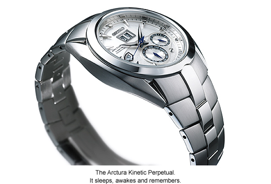 The 2009 Arctura Kinetic Perpetual is a masterpiece of understated intelligence. Its sleek exterior and calm, refined dial design combine to create a watch of restrained elegance. There is, however, nothing minimalist about the technology within. The longevity of Kinetic is allied to a perpetual calendar correct to February 28, 2100 to create a watch that is as low maintenance as any on earth. It even incorporates the remarkable Kinetic Auto Relay function, which allows the watch to go into ‘sleep’ mode after 24 hours of inactivity. While asleep, the hands stop, but the watch remembers the time for up to four years, and the hands re-set automatically to the exact time as soon as the watch is worn again.