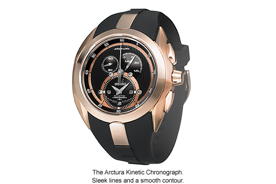 SEIKO’s unique Kinetic technology also graces the Arctura chronograph for 2009. The dial layout remains unique, with the time of day dial clearly separated from the chronograph minute hand for maximum ease of use. The case and dial design reflect exactly the aerodynamic nature of Arctura, built to sit smoothly on the wrist, with each element expressing the arc that gives the watch its name.