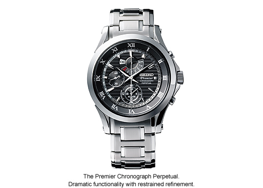 To combine a full function alarm chronograph with a perpetual calendar was an irresistible challenge, but to achieve it in a watch that retains the ease of use and classic appeal of Premier is a very considerable achievement. The key to the success is the dual function of the center hand. It indicates the date, month and leap year in the time of day mode and seconds in the chronograph mode, thus leaving the dial clean and easy to read. Once again, the very highest timekeeping technology is presented with a classic, restrained demeanor. This is the very essence of SEIKO Premier.