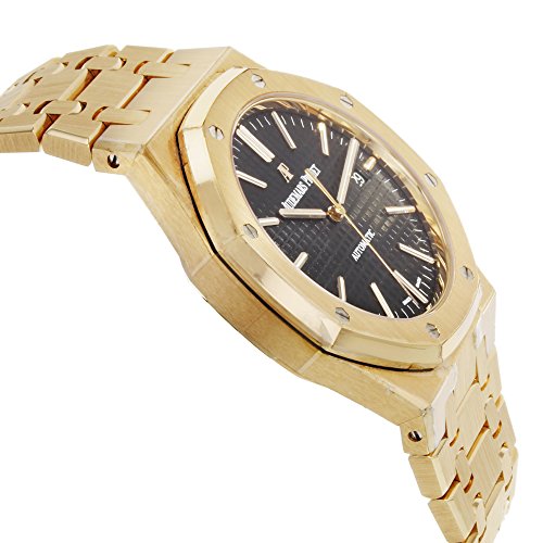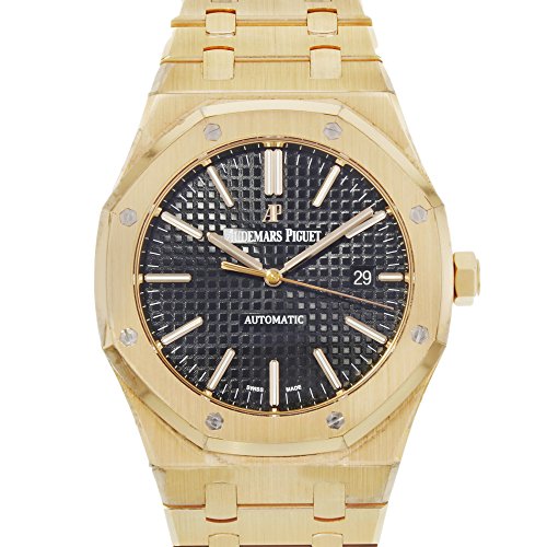 18kt rose gold case with a 18kt rose gold bracelet. Bi-directional rotating 18kt rose gold bezel. Black grande tapisserie dial with rose gold-tone hands and index hour markers. Minute markers around the outer rim. Dial Type: Analog. Luminescent hands and markers. Date display at the 3 o'clock position. Automatic movement with a 60-hour power reserve. Scratch resistant sapphire crystal. Pull / push crown. Transparent case back. Case diameter: 41 mm. Case thickness: 9.80 mm. Round case shape. Band width: 20.3 mm. Band length: 8 inches. Fold over push button clasp. Water resistant at 50 meters / 165 feet. Functions: date, hour, minute, second. Luxury watch style. Watch label: Swiss Made. Item Variations: 15400OR OO 1220OR 01, 15400OR-OO-1220OR-01, 15400OROO1220OR01. Audemars Piguet Royal Oak Automatic Black Dial 18kt Rose Gold Bracelet Mens Watch 15400OROO1220OR01.