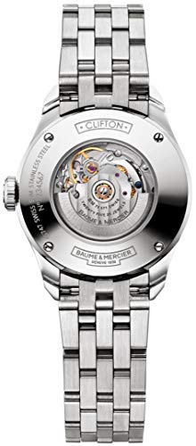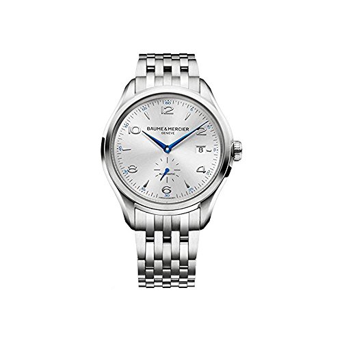 - Silver sun-brushed dial with 'Baume & Mercier Geneve' under the 12 o'clock position and 'Automatic' above the 6 o'clock position