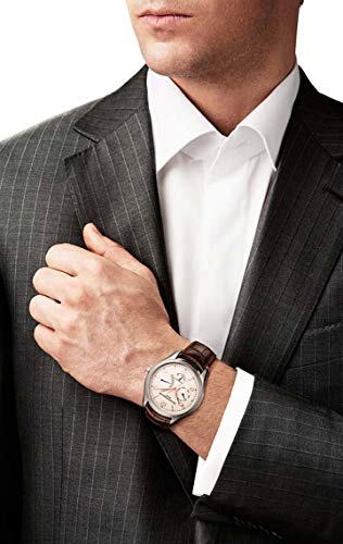 - Water resistant to 5 ATM/50 meters/165 feet, Brown alligator leather strap with stitching, Push button deployment buckle, Fits up to an 8.5 inch wrist
