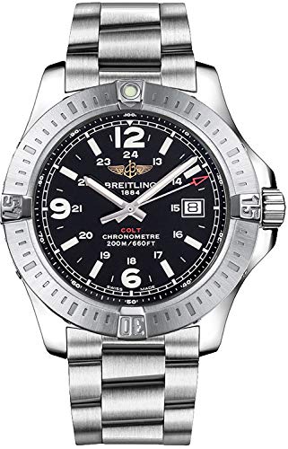 Brushed stainless steel case with a stainless steel professional III bracelet. Uni-directional rotating stainless steel bezel with a black top ring. Volcano black dial with silver-tone hands and Arabic numeral hour markers. Minute markers. 24 hour markers. Dial Type: Analog. Luminescent hands and markers. Date display at the 3 o'clock position. Automatic movement with a 42-hour power reserve. Scratch resistant sapphire crystal. Screw locked crown - two gaskets. Solid case back. Case diameter: 44 mm. Case thickness: 14.20 mm. Round case shape. Deployment clasp. Water resistant at 1000 meters / 3300 feet. Functions: date, hour, minute, second. Luxury watch style. Breitling Superocean II 44 Volcano Black Dial Stainless Steel Automatic Men's Watch A17392D7/BD68.