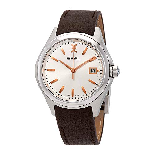 Silver-tone stainless steel case with a brown (calfskin) leather strap. Fixed silver-tone stainless steel bezel. Silver galvanic dial with rose gold-tone hands and index hour markers. Minute markers around the outer rim. Dial Type: Analog. Date display at the 3 o'clock position. Quartz movement. Scratch resistant sapphire crystal. Pull / push crown. Solid case back. Round case shape, case size: 40 mm, case thickness: 10 mm. Band width: 20 mm. Deployment clasp. Water resistant at 50 meters / 165 feet. Functions: date, hour, minute, second. Watch label: Swiss Made. Ebel Wave Silver Galvanic Dial Men's Watch 1216330.