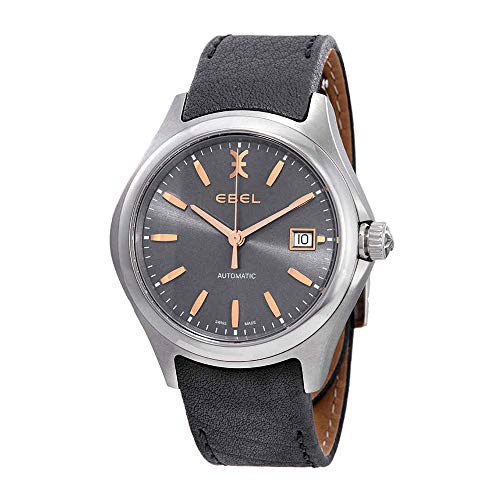 Stainless steel case with a grey (calfskin) leather strap. Fixed stainless steel bezel. Grey galvanic dial with rose gold-tone hands and index hour markers. Minute markers around the outer rim. Dial Type: Analog. Date display at the 3 o'clock position. Automatic movement. Scratch resistant sapphire crystal. Pull / push crown. Transparent case back. Round case shape. Case size: 40 mm. Case thickness: 10 mm. Band width: 20 mm. Deployment clasp. Water resistant at 50 meters / 165 feet. Functions: date, hour, minute, second. Luxury watch style. Watch label: Swiss Made. Ebel Wave Automatic Grey Galvanic Dial Men's Watch 1216332.