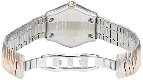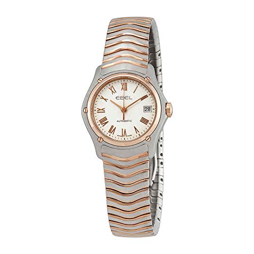 Stainless steel case with a stainless steel bracelet with 18kt rose gold bars. Fixed 18kt rose gold bezel. White dial with gold-tone hands and Roman numeral hour markers. Minute markers around the outer rim. Dial Type: Analog. Ebel calibre 200 automatic movement with a 40-hour power reserve. Scratch resistant sapphire crystal. Pull / push crown. Solid case back. Round case shape. Case size: 27 mm. Fold over clasp with a safety release. Water resistant at 50 meters / 165 feet. Functions: date, hour, minute, second. Casual watch style. Watch label: Swiss Made. Item Variations: 1200f23/0225. Ebel Classic Automatic White Dial Ladies Watch 1215926.