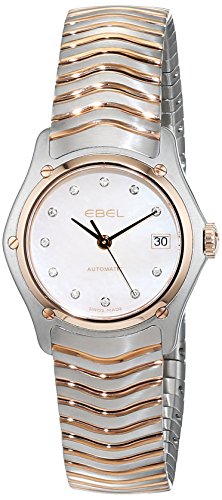 Stainless steel case with a stainless steel bracelet with 18kt rose gold bars. Fixed 18kt rose gold bezel. White mother of pearl dial with rose gold-tone hands and diamond hour markers. Dial Type: Analog. Date display at the 3 o'clock position. Ebel calibre 200 automatic movement with a 40-hour power reserve. Scratch resistant sapphire crystal. Pull / push crown. Solid case back. Round case shape. Case size: 27 mm. Fold over clasp with a safety release. Water resistant at 50 meters / 165 feet. Functions: date, hour, minute, second. Dress watch style. Watch label: Swiss Made. Item Variations: 1200f23/9925. Ebel Classic Automatic Diamond White Dial Ladies Watch 1215927.