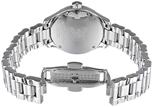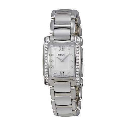 Stainless steel case with a stainless steel bracelet. Fixed dtainless steel bezel set with diamond. White mother of pearl dial with silver-tone hands and diamond hour markers. Roman numeral marks the 6 and 12 o'clock positions. Minute markers around the inner ring. Dial Type: Analog. Quartz movement. Scratch resistant sapphire crystal. Solid case back. Case diMen'sions: 23.7 mm x 29.65 mm. Case thickness: 7 mm. Rectangle case shape. Hidden folding clasp. Water resistant at 50 meters / 165 feet. Functions: hour, minute. Additional Info: alternate model number 9976m28/9810500. Luxury watch style. Watch label: Swiss Made. Ebel Brasilia Mini White Mother of Pearl Diamond Dial Ladies Watch 1215607.