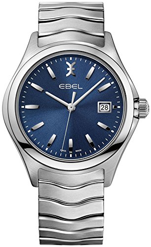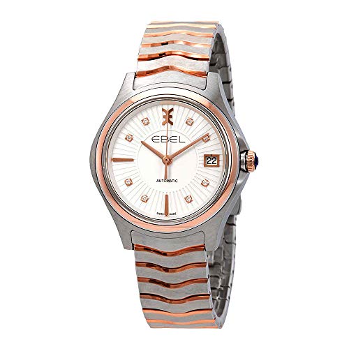 Stainless steel case with a stainless steel bracelet with 18kt rose gold wave bars. Fixed stainless steel bezel with an 18kt rose gold ring. Silver galvanic dial with rose gold-tone hands and diamond hour markers. Index markers at the 6 and 9 o'clock positions. Dial Type: Analog. Date display at the 3 o'clock position. Automatic movement. Scratch resistant sapphire crystal. Pull / push crown. Transparent case back. Round case shape. Case size: 35 mm. Case thickness: 10 mm. Band width: 15 mm. Deployment clasp with a push button release. Water resistant at 50 meters / 165 feet. Functions: date, hour, minute, second. Additional Info: dial set with 8 diamonds (0.052 t.c.w.). Dress watch style. Watch label: Swiss Made. Ebel Wave Automatic Ladies Watch 1216322.