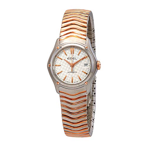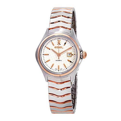 Stainless steel case with a stainless steel bracelet with 18kt rose gold wave bars. Fixed stainless steel bezel with an 18kt rose gold ring. Swiss edition dial with rose gold-tone hands and index hour markers. Dial Type: Analog. Automatic movement. Scratch resistant sapphire crystal. Round case shape. Case size: 30 mm. Fold over clasp. Water resistant at 50 meters / 165 feet. Functions: date, hour, minute, second. Dress watch style. Watch label: Swiss Made. Ebel Wave Swiss Edition Dial Automatic Ladies Watch 1216273.