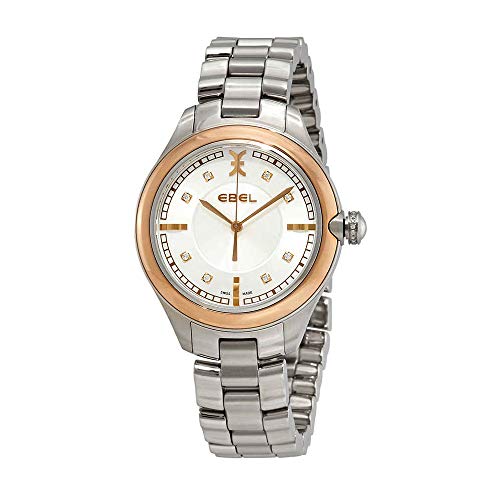 Silver-tone stainless steel case with a silver-tone stainless steel bracelet. Fixed 18kt rose gold bezel. White mother of pearl dial with yellow gold-tone hands. Arabic numerals appear at the 8 and 12 o'clock positions. Dial Type: Analog. Quartz movement. Scratch resistant sapphire crystal. Pull / push crown. Solid case back. Round case shape. Case size: 36 mm. Hidden fold over clasp. Water resistant at 50 meters / 165 feet. Functions: hour, minute, second. Casual watch style. Watch label: Swiss Made. Ebel Onde White Mother of Pearl Dial Ladies Watch 1216240.