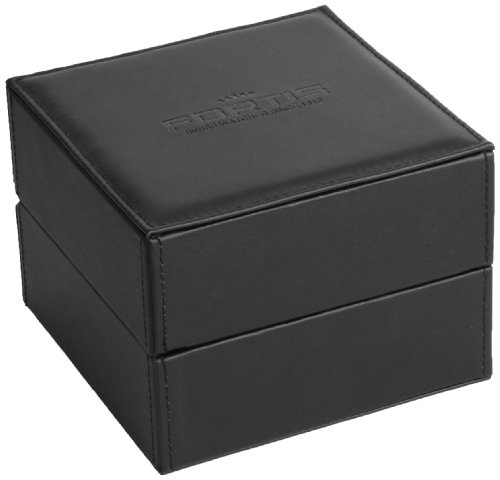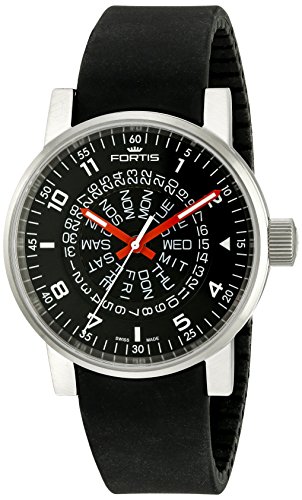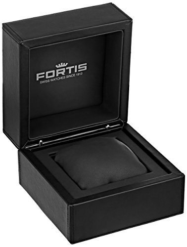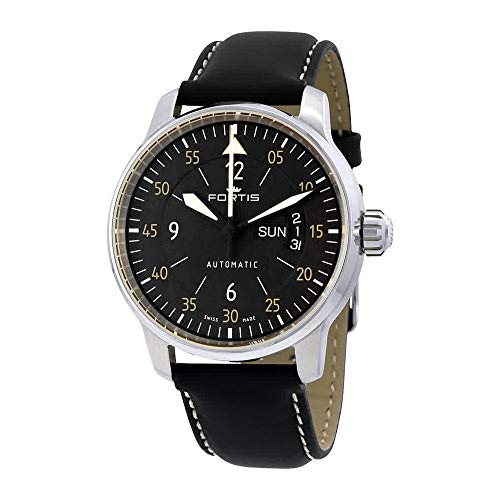 - A luxurious black calfskin strap with contrast stitching supports the round stainless steel case and textured black sunray dial of this Fortis timepiece.