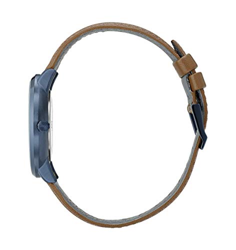 - 40mm model with a stainless steel case, grey dial with printed index, blue leather strap, and quartz multifunction movement.