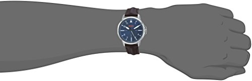 - 3-hand 42mm model with a stainless steel case, blue dial, Arabic index, brown leather strap, and quartz movement.
