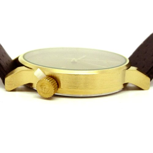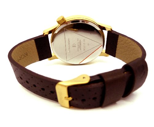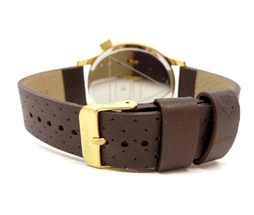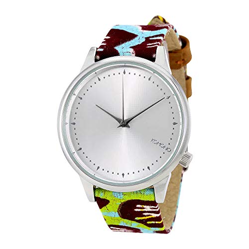 Gold-tone metal case with a multi-color print fabric strap (leather backed). Fixed gold-tone metal bezel. Gold dial with gold-tone hands and index hour markers. Minute markers around the outer rim. Dial Type: Analog. Quartz movement. Scratch resistant mineral crystal. Solid case back. Case diameter: 36 mm. Case thickness: 5 mm. Round case shape. Band width: 12 mm. Tang clasp. Water resistant at 30 meters / 100 feet. Functions: hour, minute, second. Additional Info: the strap is lined with genuine leather. Casual watch style. Watch label: Japan Movt. Komono Estelle Vlisco Gold Dial Ladies Watch W2851.