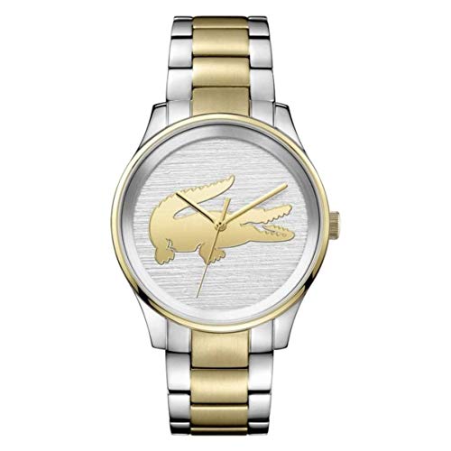 - Round watch with stick indices, baton hands, and Lacost alligator at three o'clock