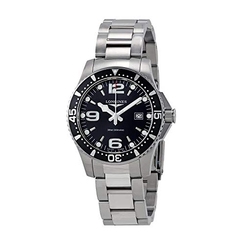 Silver-tone stainless steel case and bracelet. Uni-directional rotating silver-tone bezel with a black top ring. Black dial with luminous silver-tone hands and index hour markers. Arabic numerals mark the 6, 9 and 12 o'clock positions. Minute markers around the outer rim. Dial Type: Analog. Luminescent hands and markers. Date display at the 3 o'clock position. Quartz movement. Scratch resistant sapphire crystal. Screw down crown. Solid case back. Case size: 39 mm. Case thickness: 10 mm. Round case shape. Deployment clasp with a push button release. Water resistant at 300 meters / 1000 feet. Functions: date, hour, minute, second. Dive watch style. Watch label: Swiss Made. Longines HydroConquest Black Dial Mens Watch L3.730.4.56.6.