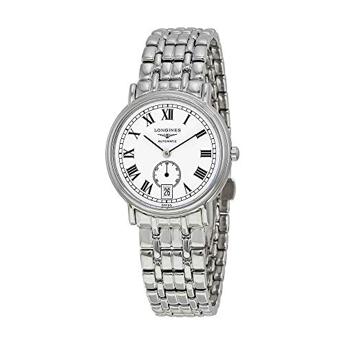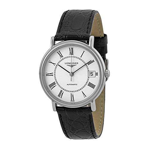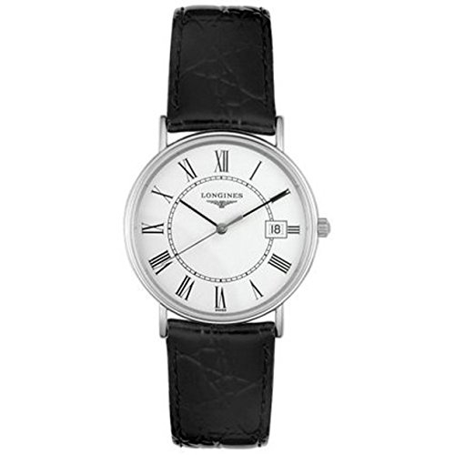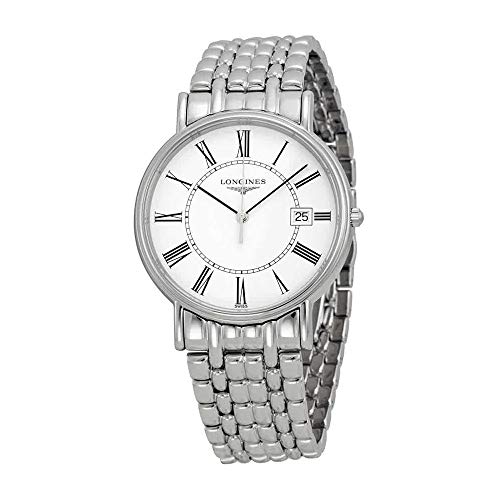 Stainless steel case with a stainless steel bracelet. Fixed stainless steel bezel. Mens dial with black and silver-tone hands and Roman numeral hour markers. Minute markers around the inner ring. Dial Type: Analog. Date display at the 3 o'clock position. Quartz movement. Scratch resistant sapphire crystal. Push / pull crown. Solid case back. Case diameter: 39 mm. Round case shape. Water resistant at 30 meters / 100 feet. Functions: date, hour, minute, second. Dress watch style. Watch label: Swiss Made. Longines La Grande Classique Presence White Dial Steel Mens Watch L4.790.4.11.6.