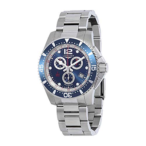 Stainless steel case with a stainless steel bracelet. Uni-directional rotating stainless steel bezel with a blue top ring. Blue dial with luminous silver-tone hands and index hour markers. An arabic numeral appears at the 12 o'clock position. Minute markers. 1/100th second markers around the outer rim. Dial type: analog. Luminescent hands and markers. Date display at the 4 o'clock position. Chronograph - three sub-dials displaying: 60 second, 30 minute and 12 hours. Longines calibre 440 quartz movement. Scratch resistant sapphire crystal. Screw down crown. Solid case back. Case size: 47. 5 mm. Case thickness: 11. 5 mm. Round case shape. Band width: 24 mm. Deployment clasp. Water resistant at 300 meters / 1000 feet. Functions: chronograph, date, hour, minute, second. Luxury watch style. Watch label: swiss made. Longines hydroconquest chronograph blue dial mens watch l38434966.