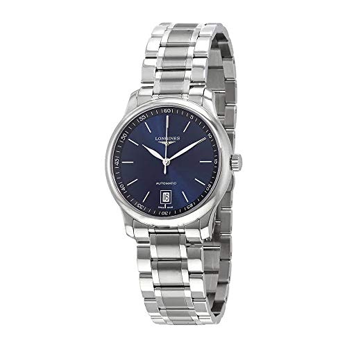 Stainless steel case with a stainless steel bracelet. Fixed stainless steel bezel. Blue dial with silver-tone hands and index hour markers. Minute markers around the outer rim. Dial Type: Analog. Date display at the 6 o'clock position. Longines calibre 619/888 automatic movement with a 42-hour power reserve. Scratch resistant sapphire crystal. Push / pull crown. Transparent case back. Case size: 38.50 mm. Round case shape. Deployment clasp. Water resistant at 30 meters / 100 feet. Functions: date, hour, minute, second. Luxury watch style. Watch label: Swiss Made. Longines Master Collection Automatic Blue Dial Men's Watch L26284926.