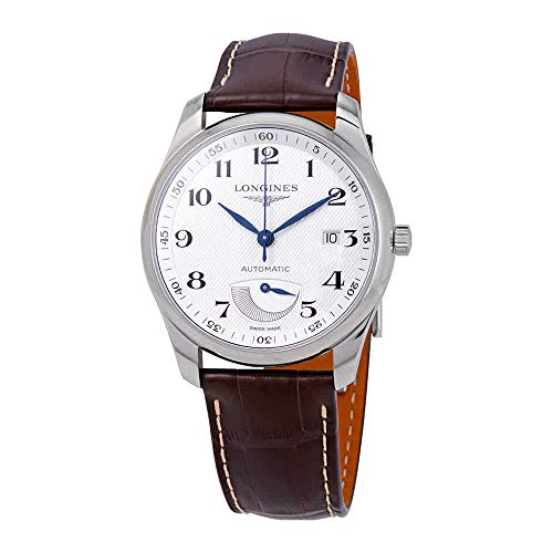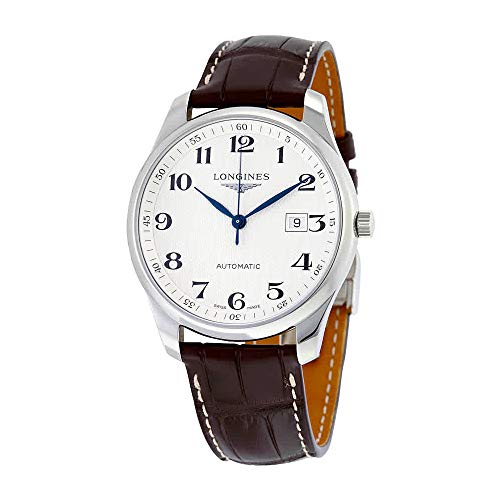 Silver-tone stainless steel case with a brown leather strap. Fixed silver-tone stainless steel bezel. Silver dial with blue hands and Arabic numeral hour markers. Minute markers around the outer rim. Dial Type: Analog. Date display at the 3 o'clock position. Longines Calibre L602 automatic movement with a 42-hour power reserve. Scratch resistant sapphire crystal. Transparent case back. Round case shape. Case size: 40 mm. Fold over with safety release clasp. Water resistant at 30 meters / 100 feet. Functions: date, hour, minute, second. Dress watch style. Watch label: Swiss Made. Longines Master Collection Automatic Silver Dial Men's Watch L2.908.4.78.3.