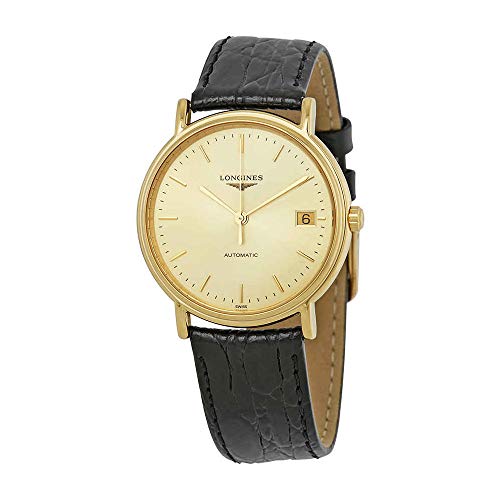 Gold-tone stainless steel case. Leather strap. Gold-tone dial. Automatic movement. Date. Water resistant 30 meters. Case 34.5mm.
