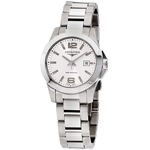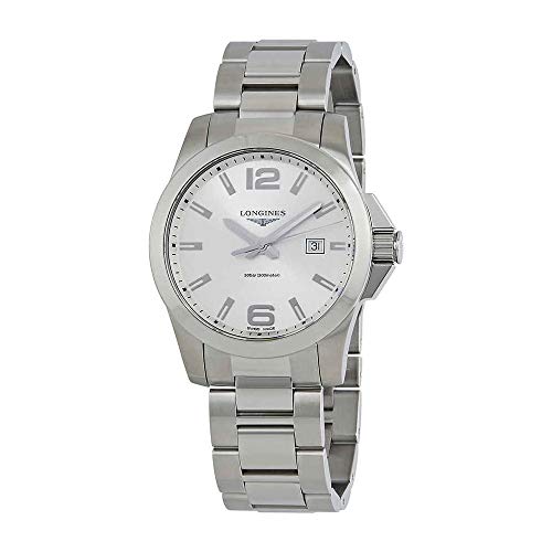 Silver-tone stainless steel case with a silver-tone stainless steel bracelet. Fixed silver-tone stainless steel bezel. Silver dial with silver-tone hands and index hour markers. Arabic numerals mark the 6 and 12 o'clock positions. minute markers around the outer rim. Dial Type: Analog. Date display at the 3 o'clock position. Quartz movement. Scratch resistant sapphire crystal. Solid case back. Case size: 43 mm. Case thickness: 11.5 mm. Round case shape. Band width: 22 mm. Fold over with double push button release clasp. Water resistant at 300 meters / 1000 feet. Functions: date, hour, minute, second. Luxury watch style. Watch label: Swiss Made. Longines Conquest Silver Dial Stainless Steel Mens Watch L37604766.