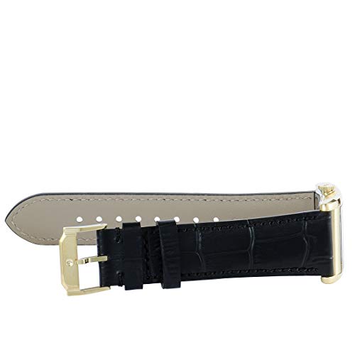 - Yellow gold ion-plated stainless steel case featuring a white mother-of-pearl dial with printed index, black leather strap, Swiss quartz movement
