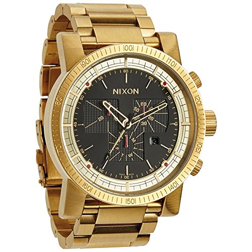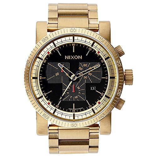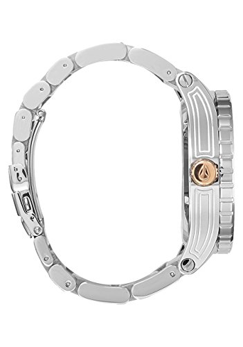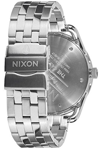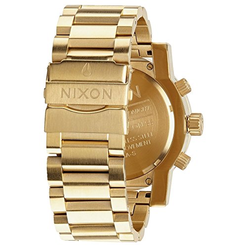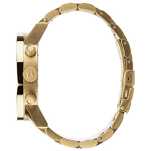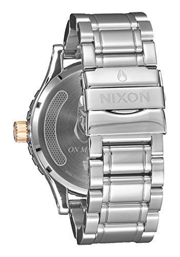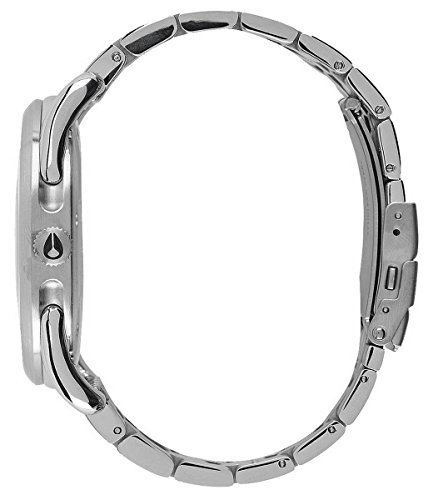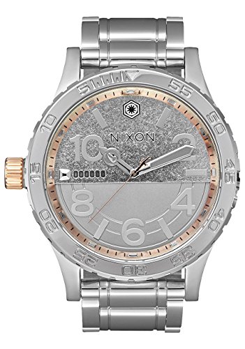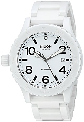 White PVD stainless steel case with a white PVD stainless steel bracelet. Uni-directional rotating white PVD bezel. White dial with white hands and Arabic numeral and index hour markers. Minute markers around the outer rim. Dial Type: Analog. Luminescent hands and markers. Date display at the 6 o'clock position. Chronograph - three sub-dials displaying: 60 second, 60 minute and 24 hour. Quartz movement. Scratch resistant mineral crystal. Solid case back. Case diameter: 51 mm. Case thickness: 14 mm. Round case shape. Band width: 20 mm. Band length: 8.5 inches. Deployment clasp. Water resistant at 100 meters / 330 feet. Functions: chronograph, date, hour, minute, second. Casual watch style. Nixon 51-30 Chronograph White Dial White PVD Mens Watch A0831255.