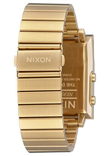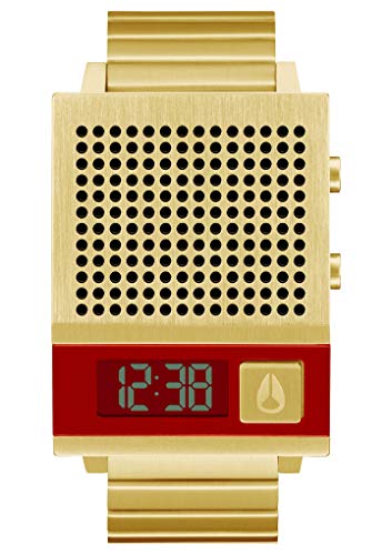 Nixon Dork Too watch. A Nixon icon that doesn't take itself too seriously. Press a button and it yells the time and much more. Comes fully juiced, but when it does run low just plug in to your USB. This is easy, eye-free time telling that's easy on the eyes. A contemporary take on a clean timeless style. Re-chargable. Just plug it into your USB. A watch with a real personality, push the button and it says the time and much more. With edge to edge crystal. Functions include time, date, alarm and EL backlight. 34mm custom injection molded stainless steel case with perforated stainless steel speaker cover and pushers, with micro USB charging port. 21mm custom folded stainless steel single link bracelet with butterfly clasp closure. Imported.