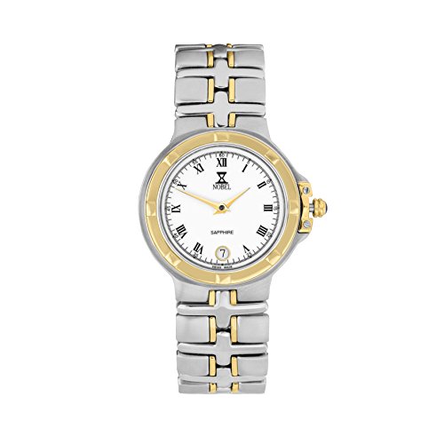 Nobel Solid Stainless Steel Two/Tone Gents Timepiece. The Watch Frame is finished in High-Polished Stainless steel for a very striking and attractive look. The watch bracelet is finished with a combination of high-polished yellow-gold plated and stainless links. This classic watch contains a white textured dial with applied gold hour-markers, and a date at the 6:00 hour. It contains a Swiss movement, a scratch-resistant sapphire crystal and is water-resistant to 3 ATM.