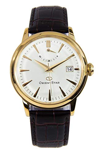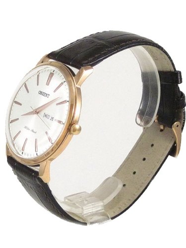 The Orient Capital is a classic dress style watch with a soft white dial offset with applied goldtone hour markers and hands. It features a slim 40mm goldtone stainless steel case with a domed mineral crystal and a solid case back. A sleek day and date window is at 3:00 and a small textured crown is provided to adjust the time and day and date. The watch is powered by an analog quartz movement, caliber HS911. A brown alligator grained leather strap with a matching buckle closure secures the watch to your wrist. It is a really gorgeous dress watch design. Features Movement: Japanese quartz (battery operated) Case: Rose goldtone stainless steel, 40.5mm x 7.93mm thick. Back: Solid back Crystal: Domed Mineral Band: Brown alligator grained Leather, buckle closure Water Resistant: 30 meters Warranty: 1 Year