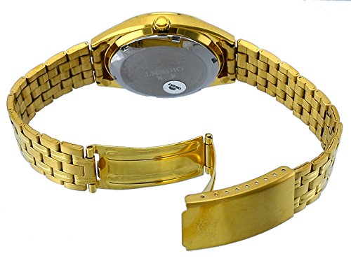 - Mineral Crystal, Push Button Day/Date Display with Spanish Option, Gold Tone Hands and Markers