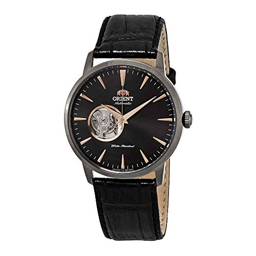 Black ion-plated stainless steel case with a black leather strap. Fixed black ion-plated bezel. Black (open heart) dial with rose gold-tone hands and index hour markers. Minute markers around the outer rim. Dial Type: Analog. Orient calibre F6T22 automatic movement with a 40-hour power reserve. Scratch resistant mineral crystal. Pull / push crown. Transparent case back. Round case shape. Case size: 41 mm. Case thickness: 12 mm. Band width: 21 mm. Tang clasp. Water resistant at 50 meters / 165 feet. Functions: hour, minute, second. Casual watch style. Watch label: Japan Movt. Orient Open Heart Automatic Black Dial Men's Watch FAG02001B0.