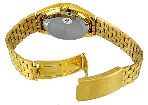 - Mineral Crystal, Day/Date Display with Spanish Option, Gold Tone Hands and Markers