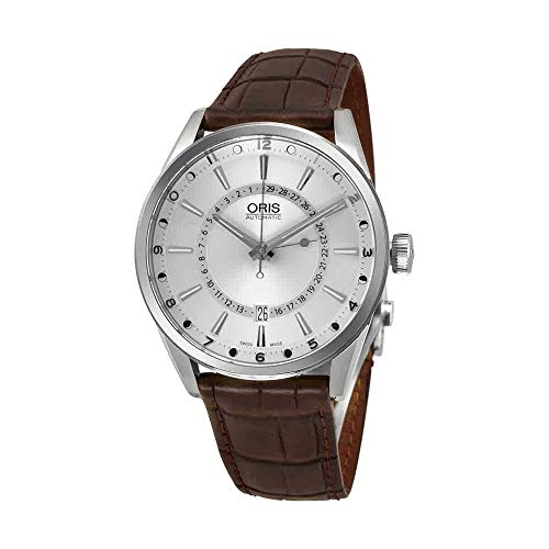 Stainless steel case with a brown leather strap. Fixed stainless steel bezel. Silver dial with silver-tone hands and index / Arabic numeral hour markers. Minute markers. Moonphase around the outer rim. Date scale around an inner ring. Dial Type: Analog. Luminescent hands and markers. Date display at the 6 o'clock position. Oris Calibre 761 automatic movement with a 38-hour power reserve. Scratch resistant sapphire crystal. Pull / push crown. Skeleton case back. Case size: 42 mm. Case thickness: 12.10 mm. Round case shape. Band width: 21 mm. Band length: 8 inches. Deployment clasp with a push button release. Water resistant at 100 meters / 330 feet. Functions: hour, minute,moon phase, date. Luxury watch style. Watch label: Swiss Made. Oris Artix Pointer Moon Silver Dial Brown Leather Men's Watch 76176914051LS.