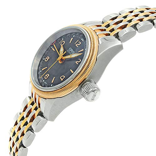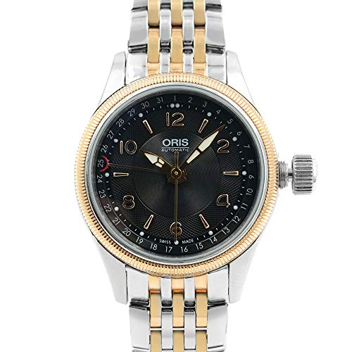 Silver-tone stainless steel case with a two-tone (silver-tone and rose gold-tone) stainless steel bracelet. Fixed gold-tone stainless steel bezel. Black dial with gold-tone hands and Arabic numeral and index hour markers. Dial Type: Analog. Luminescent hands and markers. Pointer date. One - date subdial. Oris Calibre 594, base ETA 2671 automatic movement with a 38-hour power reserve. Scratch resistant sapphire crystal. Round case shape. Case size: 29 mm. Fold over clasp. Water resistant at 100 meters / 330 feet. Functions: date, hour, minute, second. Casual watch style. Watch label: Swiss Made. Oris Big Crown Pointer Date Two-tone Automatic Black Dial Ladies Watch 01 594 7680 4334-07 8 14 32.