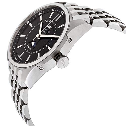 Stainless steel case with a stainless steel bracelet. Fixed bezel. Black dial with silver-tone hands and stick / Arabic numeral hour markers. Minute markers around the outer rim. Dial Type: Analog. Luminescent hands and markers. Pointer date display around inner rim. Month and day of the week below the 12 o'clock position. Automatic movement with 38 hour power reserve. Scratch resistant sapphire crystal. Skeleton case back. Case diameter: 42 mm. Round case shape. Deployment clasp with push button. Water resistant at 100 meters / 330 feet. Functions: moonphase, month, date, day, hour, minute, second. Luxury watch style. Watch label: Swiss Made. Oris Artix Complication Automatic Black Dial Stainless Steel Mens Watch 01 915 7643 4054 07 8 21 80.