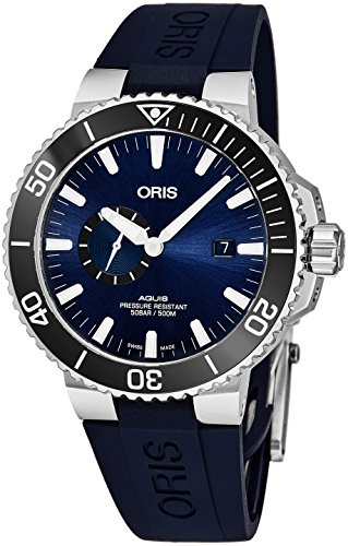 - Blue dial with 'Oris' under the 12 o'clock position, Silver-tone hands with luminescent coating, Applied silver-tone luminescent indices, Black guilloche small seconds sub-dial