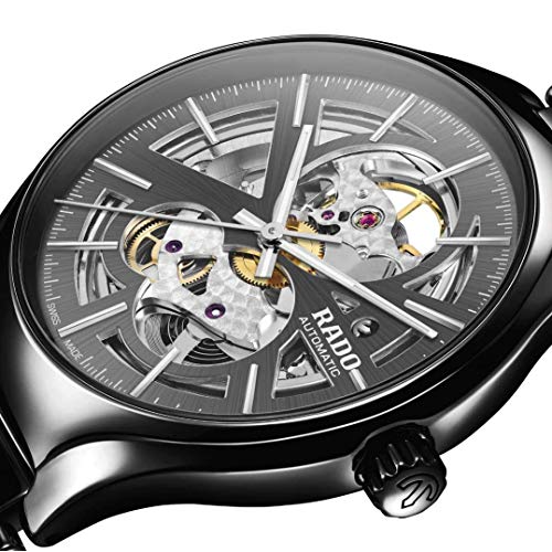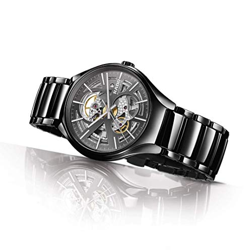 - Grey ceramic case with skeleton dial