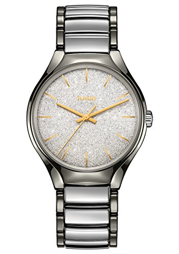 Grey plasma high-tech ceramic, stainless steel case with a grey plasma high-tech ceramic, stainless steel bracelet. Fixed grey bezel. Metallic silver glitter dial with gold-tone hands and index hour markers. Dial Type: Analog. Rado Calibre 763 (ETA C07.611) automatic movement with an 80-hour power reserve. Scratch resistant sapphire crystal. Transparent case back. Round case shape, case size: 40 mm, case thickness: 10.5 mm. Butterfly clasp. Water resistant at 50 meters / 165 feet. Functions: hour, minute, second. Additional Info: limited edition of 1001 pieces. Casual watch style. Watch label: Swiss Made. Rado True Blaze Metallic Silver Glitter Dial Men's Limited Edition Watch R27057092.