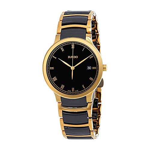 Gold-tone stainless steel case with a black high-tech ceramic and PVD steel bracelet. Fixed bezel. Black dial with gold-tone hands and Roman numeral hour markers. Minute markers around the outer rim. Dial Type: Analog. Date display at the 3 o'clock position. Quartz movement. Scratch resistant sapphire crystal. Solid case back. Case size: 38 mm. Round case shape. Water resistant at 30 meters / 100 feet. Functions: date, hour, minute, second. Dress watch style. Watch label: Swiss Made. Rado Centrix Gold-tone PVD and High-Tech Ceramic Watch R30527152.