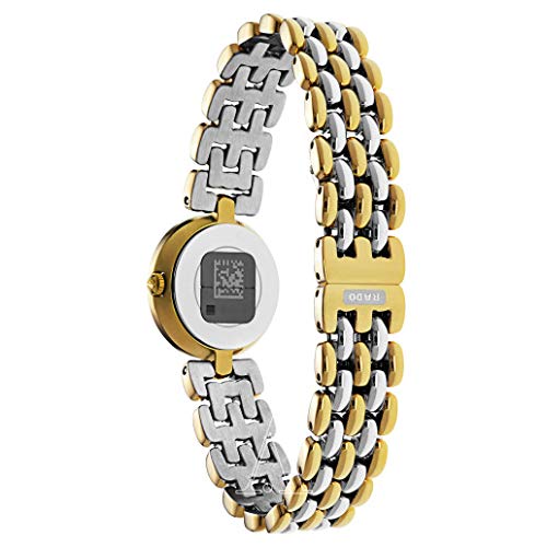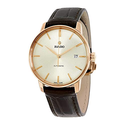 Rose gold PVD stainless steel case with a dark brown leather strap. Fixed rose gold PVD bezel. Champagne dial with rose gold-tone hands and index hour markers. Dial Type: Analog. Date display at the 3 o'clock position. ETA C07.611 automatic movement with an 80-hour power reserve. Scratch resistant sapphire crystal. Transparent case back. Case size: 38 mm. Case thickness: 10 mm. Round case shape. Band width: 19 mm. Deployment clasp. Water resistant at 50 meters / 165 feet. Functions: date, hour, minute, second. Additional Info: ref# 01.763.3861.2.111. Suitable for use around household sinks playing sports and swimming in shallow water but not bathing snorkeling or scuba divin. Dress watch style. Watch label: Swiss Made. Rado Coupole Classic Automatic Champagne DialUnisex Watch R22861115.