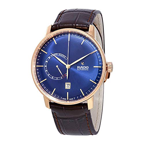 Rose gold-tone stainless steel case with a brown (croc-embossed) leather strap. Fixed rose gold-tone bezel. Blue dial with rose gold-tone hands and index hour markers. Minute markers around the outer rim. Dial Type: Analog. Date display above the 6 o'clock position. Power reserve indicator. Automatic movement with an 80-hour power reserve. Scratch resistant sapphire crystal. Transparent case back. Round case shape. Case size: 41 mm. Case thickness: 11.7 mm. Band width: 21 mm. Deployment clasp with a push button release. Water resistant at 50 meters / 165 feet. Functions: date, hour, minute, second, power reserve. Dress watch style. Watch label: Swiss Made. Rado Coupole Classic XL Automatic Blue Dial Men's Watch R22879205.