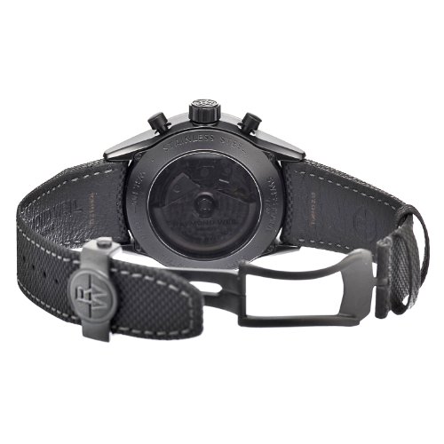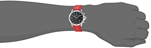 - Black stainless steel watch featuring black dial with three chronograph subdials, day/date window, and red color pops at seconds hand and tachymeter