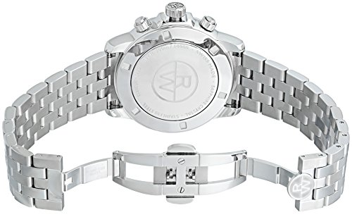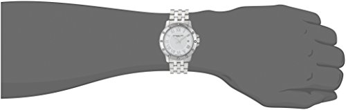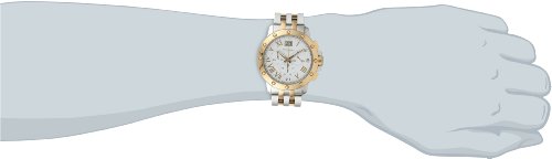 - Stainless steel case with a two-tone (rose gold pad and silver-tone) stainless bracelet; fixed rose gold pad bezel; white dial with silver-toned hands and roman numeral hour markers; minute markers around an inner ring