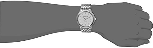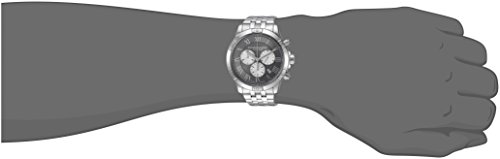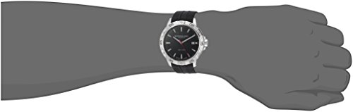 - Stainless steel case with a black leather strap. Fixed stainless steel bezel. Silver dial with silver-tone hands and index hour markers. Minute markers around the outer rim. Dial Type: analog. Date display at the 3 o'clock position. Seconds sub-dial above the 6 o'clock position. Quartz movement