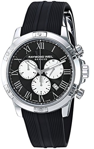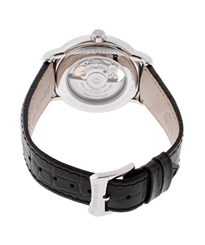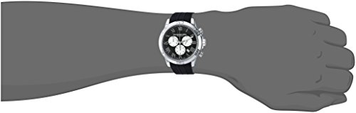 - Fixed stainless steel bezel. Black dial with luminous silver-tone hands and Roman numeral hour markers. Minute markers around the outer rim.